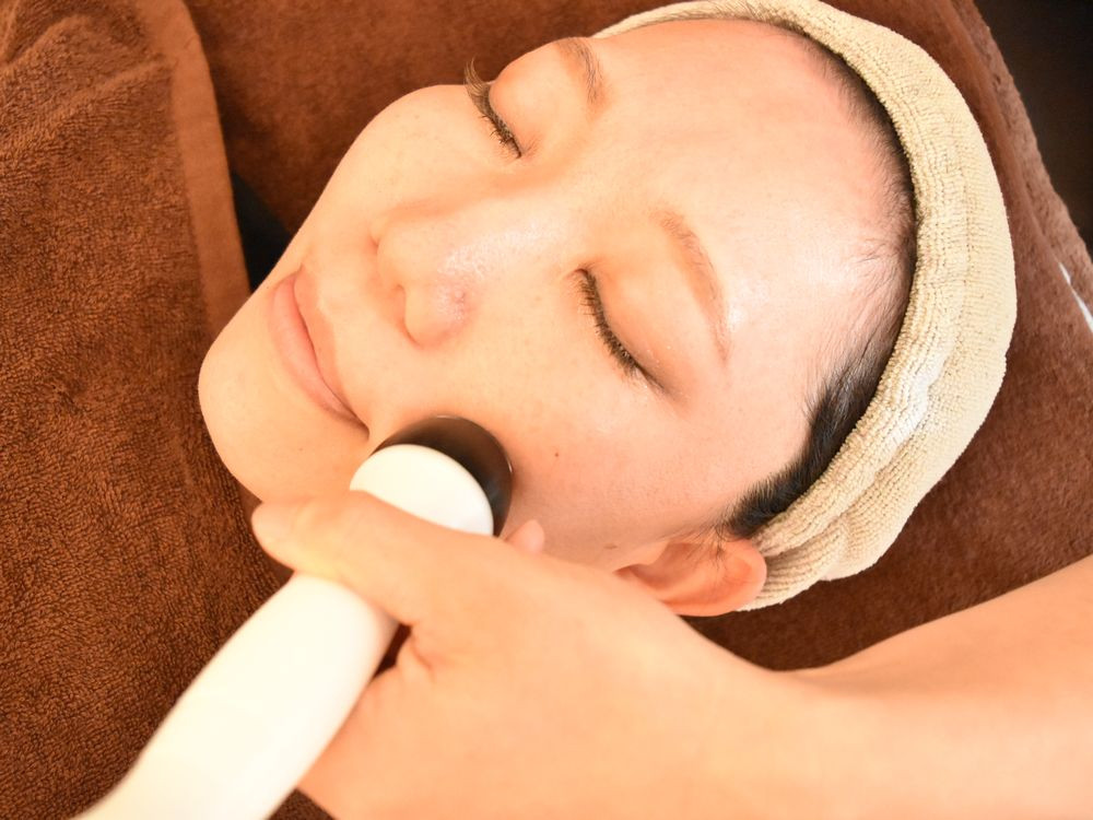 ビリビリするのかな?と思われる方もいらっしゃるかと思いますが、治療器の性能により皮膚表面の抵抗感を少なくおくまで通すことができるので、痛みはほとんどありません。とれいんならではのフェイシャルです。